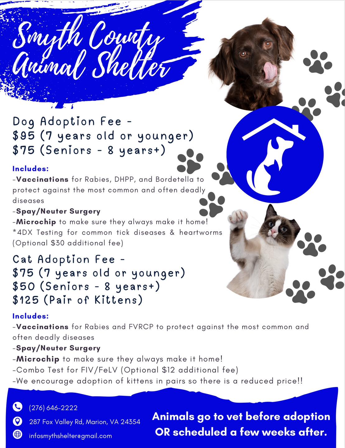 Announcing new adoption services and fees at the Smyth County Animal Shelter. Vet services are being scheduled and/or provided prior to your new pet going home including