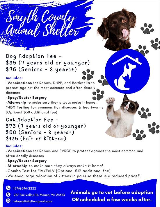 Announcing new adoption services and fees at the Smyth County Animal Shelter. Vet services are being scheduled and/or provided prior to your new pet going home including